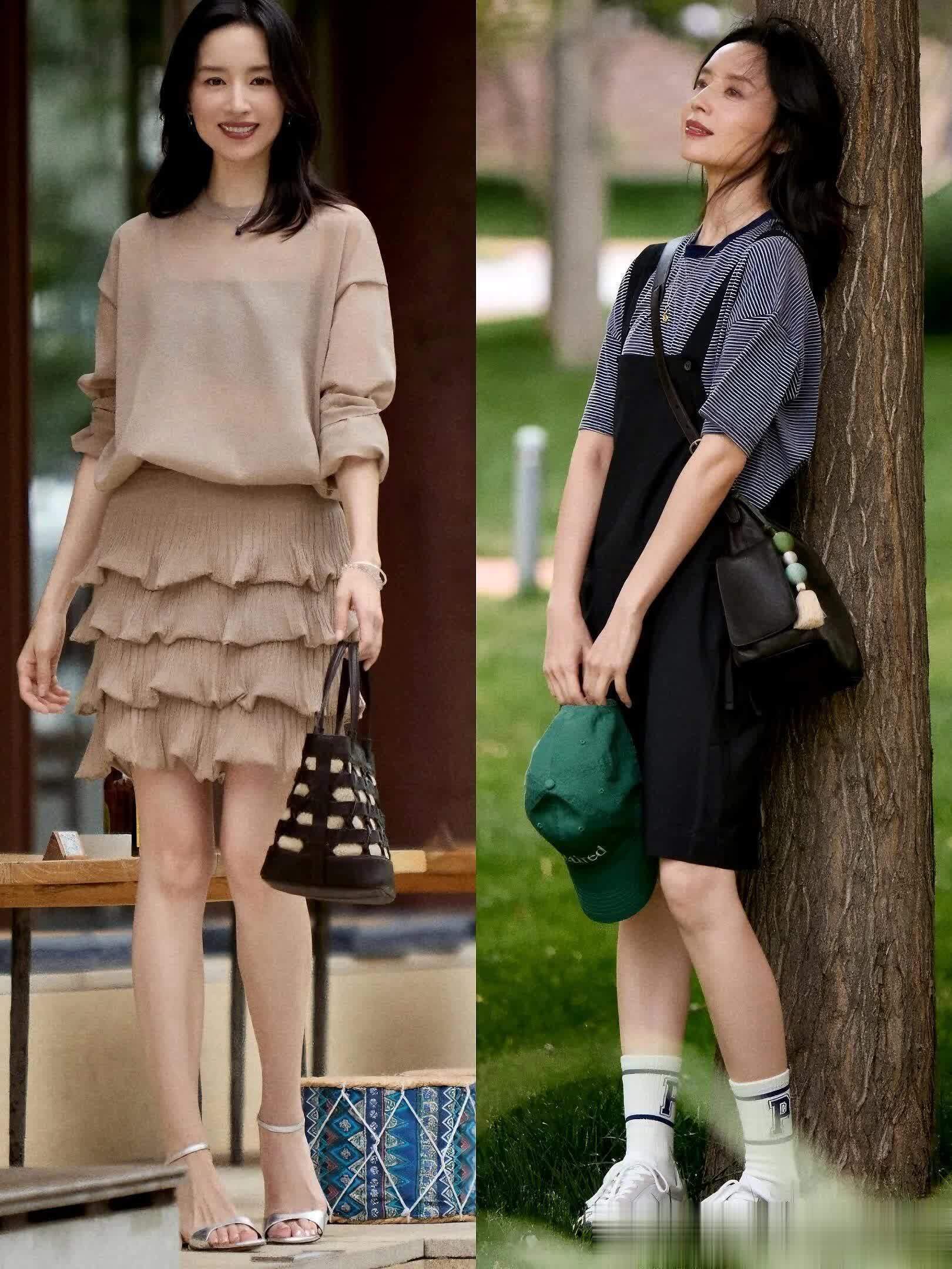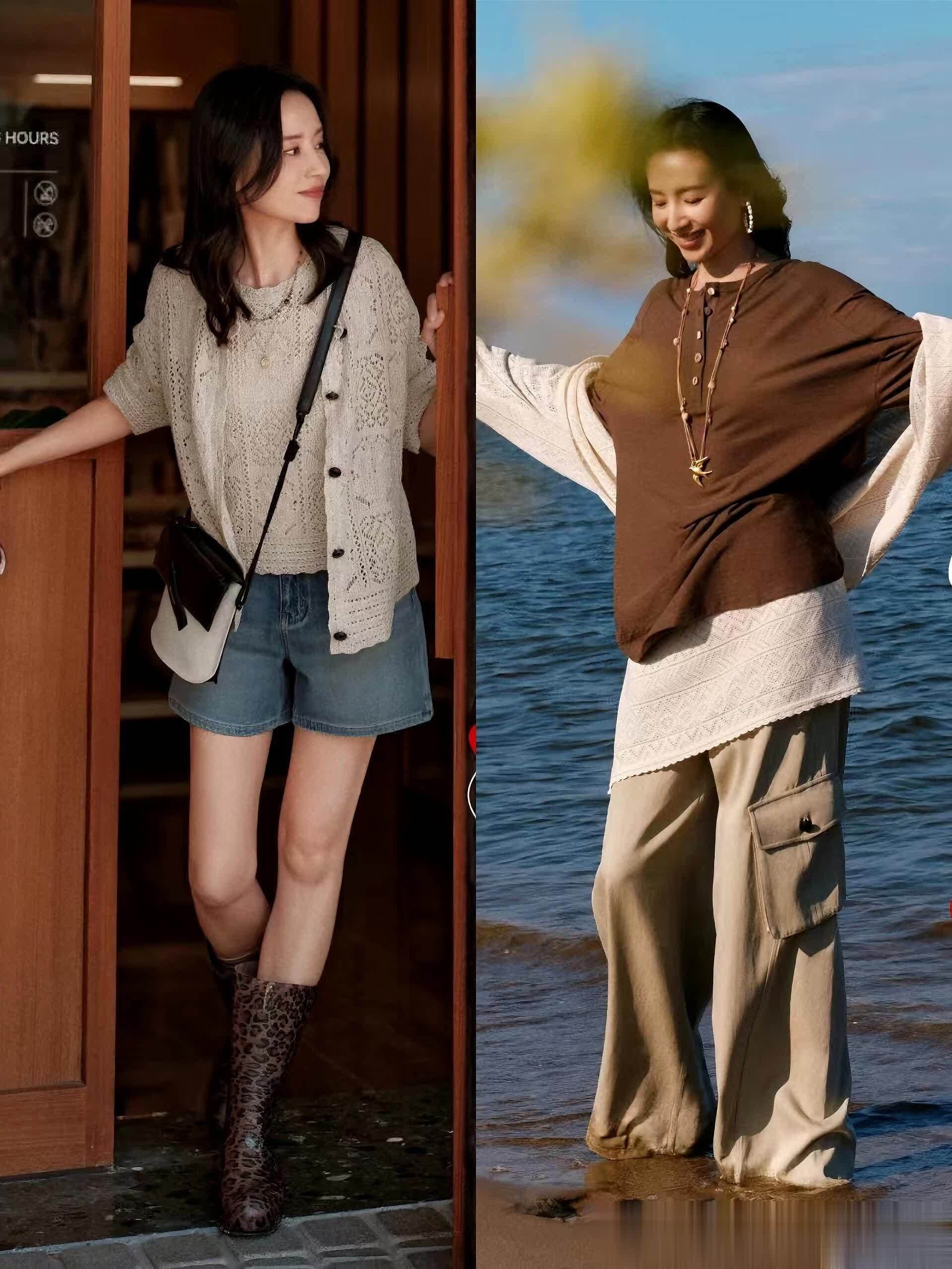 米白针织开衫选的是镂空款,软乎乎的摸着像云朵,秋风吹过来也不觉得闷,关键是叠穿短袖特别有层次感~ 董洁这套把“慵懒”和“精致”平衡得刚刚好,上次我穿类似款去逛咖啡店,店员小姐姐直接上手摸我开衫,追着问“在哪买的?看着好软”;下午拍ootd,摄影师都夸“这开衫和复古滤镜绝配”,心里偷偷美死~